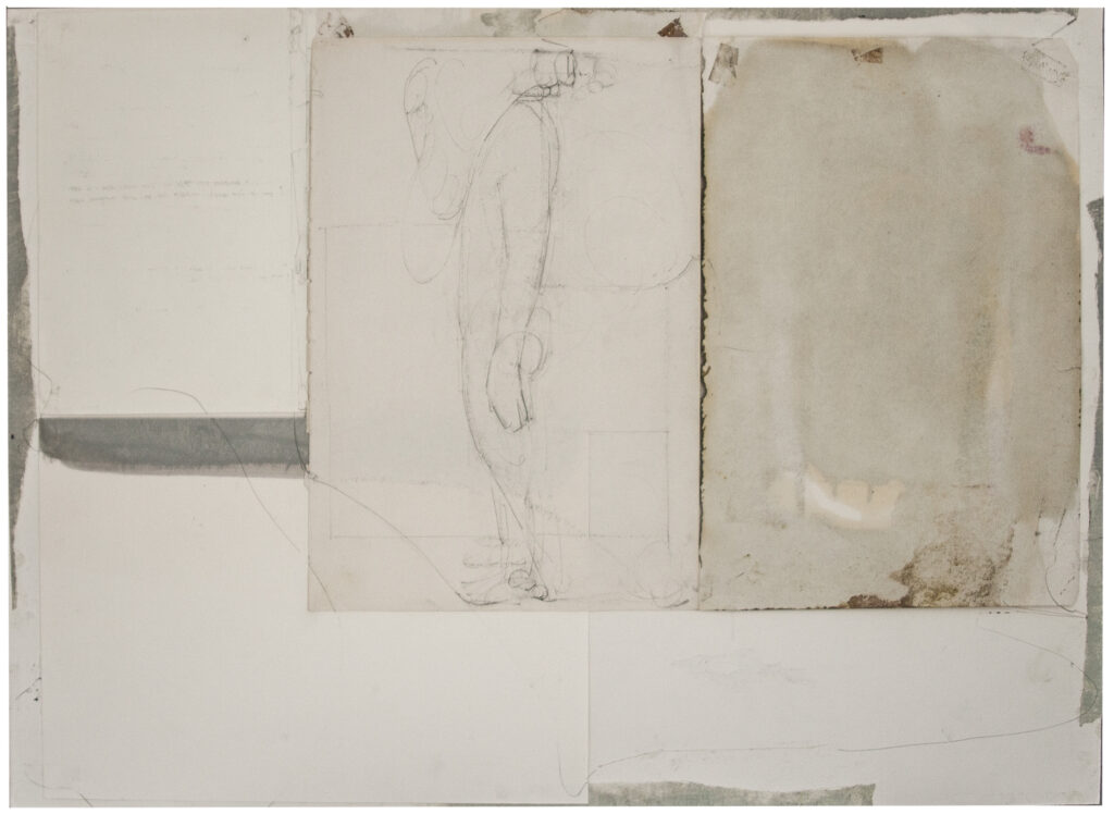Räume, 2026, Bleistift, Öl, transparentes Tesa, Masking-Tape, Papier-Collage