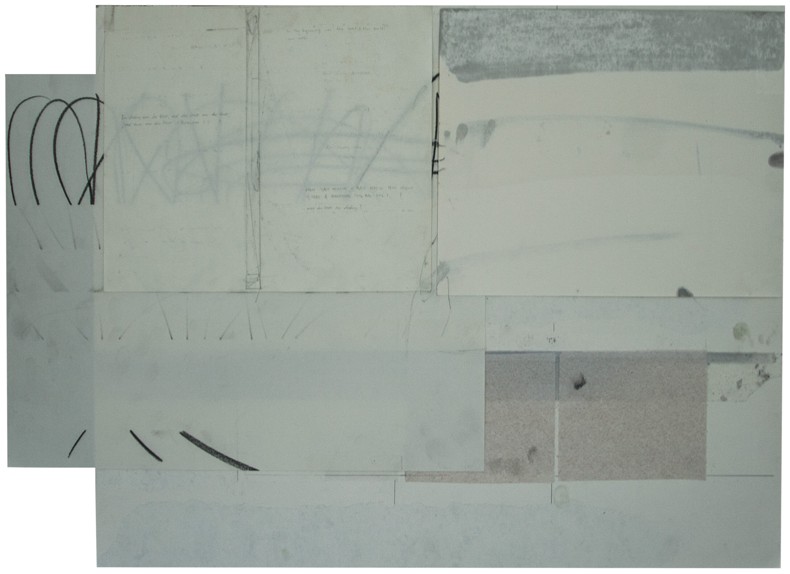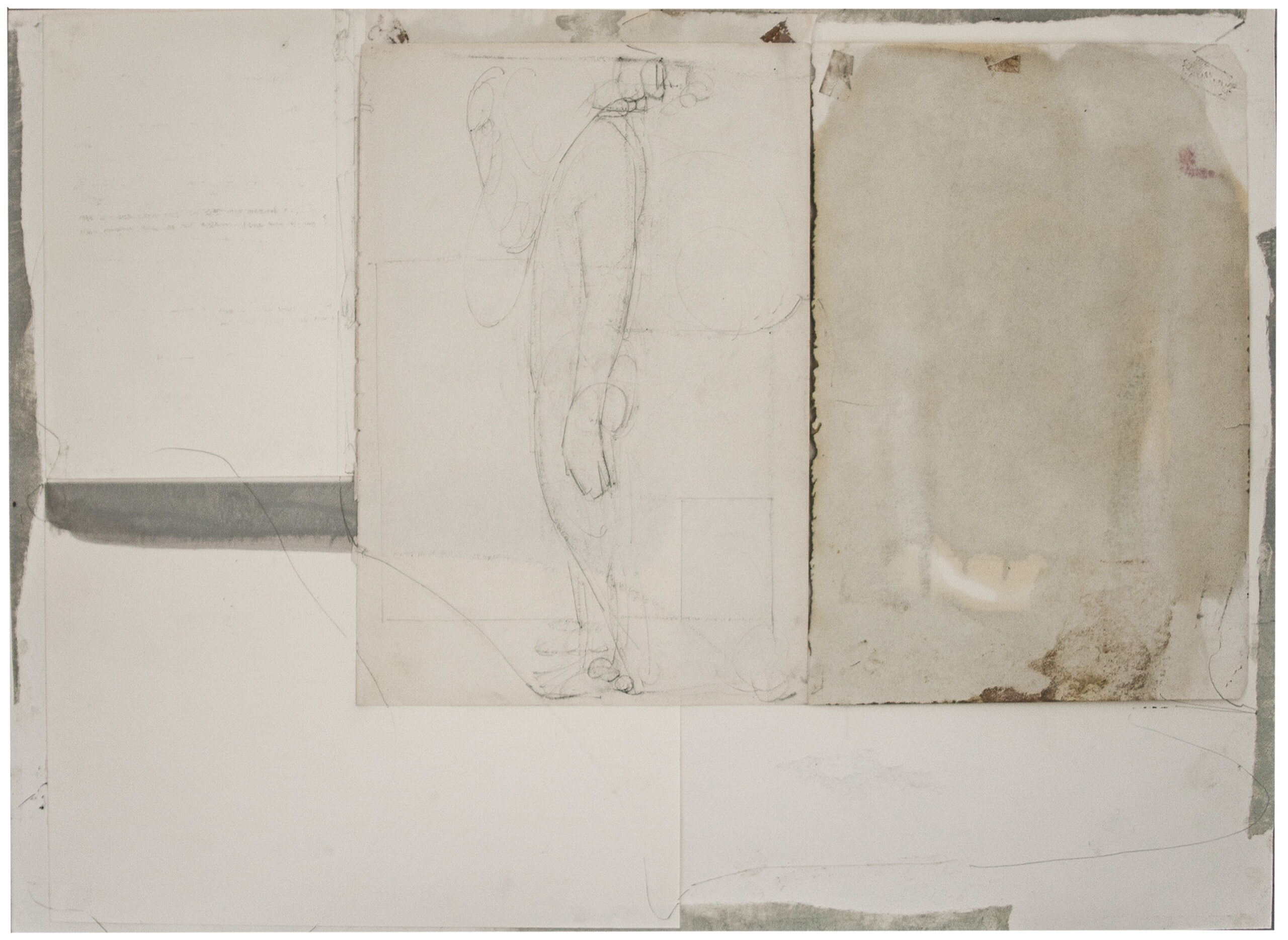 Räume, 2026, Bleistift, Öl, transparentes Tesa, Masking-Tape, Papier-Collage, Kaffeepulver