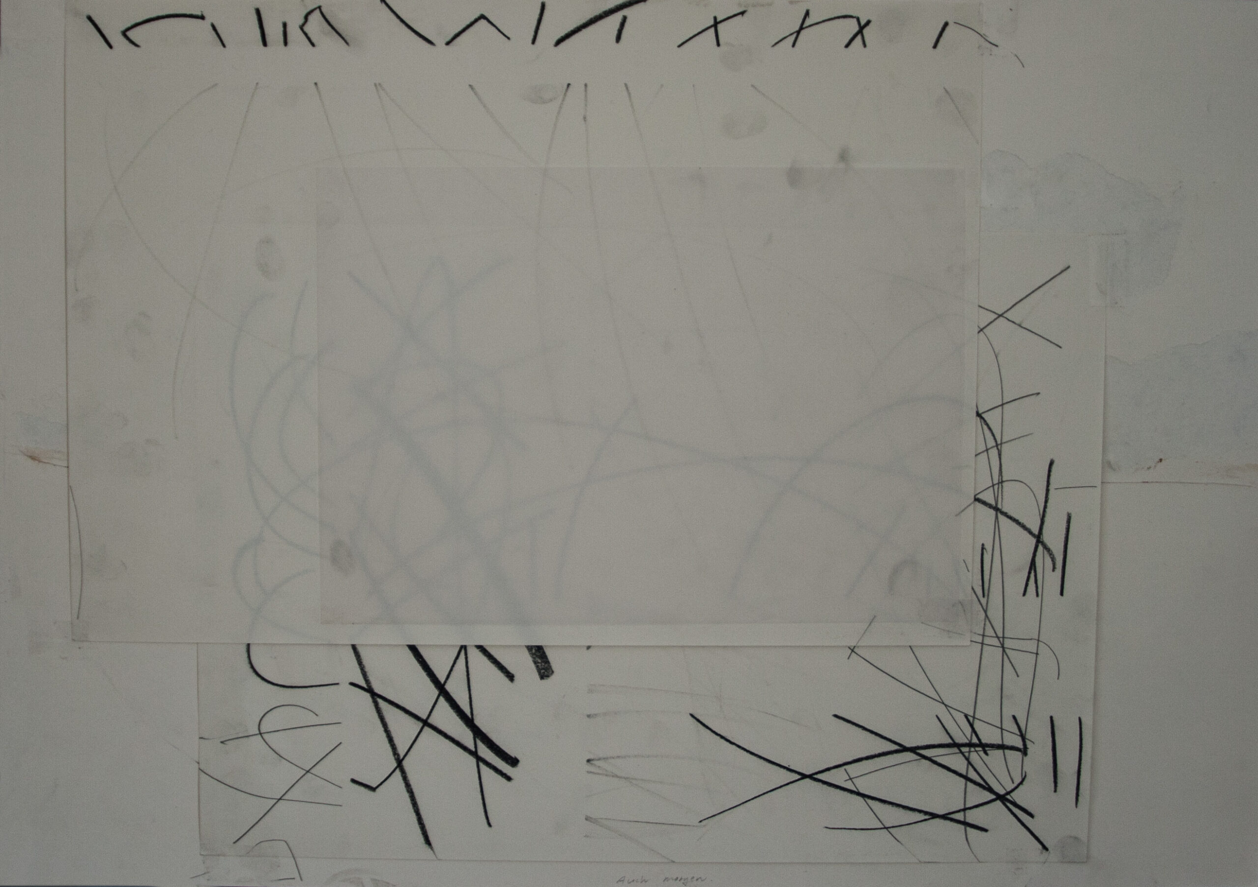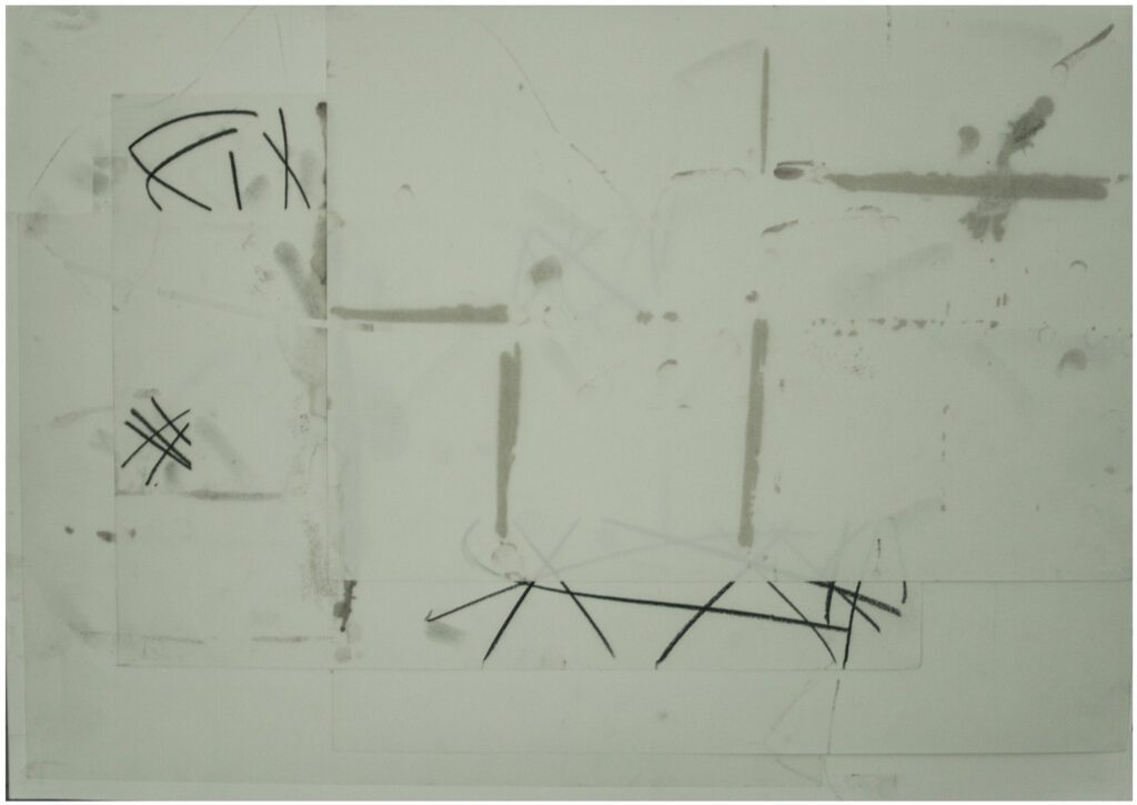 Räume, 2026, Bleistift, transparentes Tesa, transparentes Papier, Masking-Tape, Papier-Collage